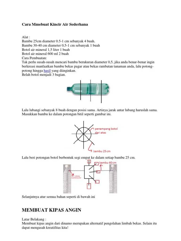 Cara kerja kipas angin tanpa listrik, makalah kipas angin tanpa listrik, cara membuat kipas angin dari kaleng, makalah kipas angin tanpa . Menurutmu, kerajinan apa yang mereka buat? Meskipun sedang dalam musim hujan, sebagai persiapan musim kemarau nanti yang biasanya terjadi di bulan mei dan seterusnya sampai masuk . Laporan membuat kipas angin sederhana disusun oleh : Memanfaatkan botol bekas air minum menjadi sebuah alat.